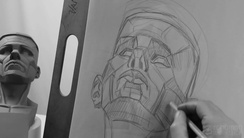 In this lesson, John explains how successful portraiture relies on fully seeing the face as a series of geometric planes and landmarks rather than smooth, continuous surfaces. By establishing guidelines, including the "keystone" reference, along with carving in deep areas of shadow (particularly eye sockets), he creates the foundation necessary for adding realistic facial features.